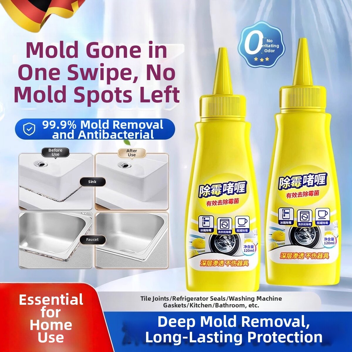 One product for your whole home. Perfect for bathrooms, kitchens, refrigerator gaps, washing machines, sinks, and hard-to-reach corners — restoring a bright, mold-free environment.